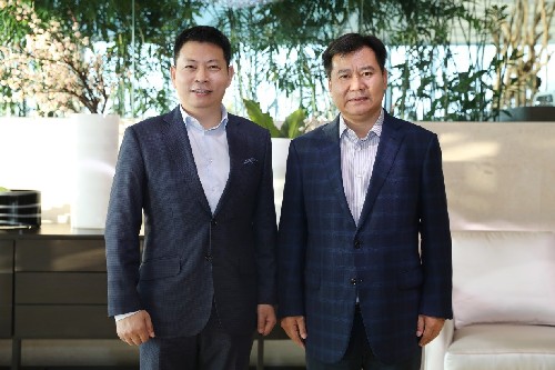 蘇寧控股集團董事長張近東在蘇寧總部會晤華為消費者業(yè)務CEO余承東