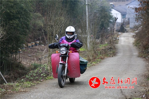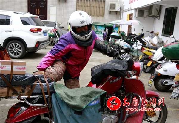 新春之際,陜南天氣依然寒冷。趙明翠戴上頭盔,捆綁好厚厚的護(hù)膝,艱難得跨上摩托車,點(diǎn)火起步出發(fā),開始了一天的投遞工作。記者驅(qū)車緊跟隨其后,在很多拐彎和上下坡路段,我們看到趙明翠為了平衡摩托車,經(jīng)常是兩腳尖著地。
