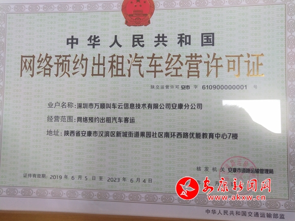本網(wǎng)訊 (實(shí)習(xí)記者 羅偉)6月11日,安康市首張網(wǎng)絡(luò)預(yù)約出租汽車經(jīng)營許可證發(fā)放,將進(jìn)一步滿足我市社會公眾多樣化出行需求,規(guī)范網(wǎng)絡(luò)預(yù)約出租汽車經(jīng)營服務(wù)行為,促進(jìn)出租汽車行業(yè)和互聯(lián)網(wǎng)融合發(fā)展。ehN安康新聞網(wǎng)