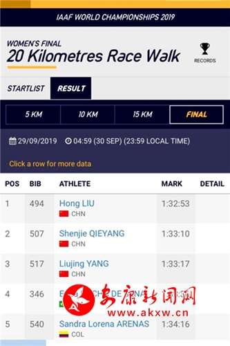 本報(bào)訊(記者 魏濤 通訊員 章理)9月30日,在2019年多哈田徑世錦賽女子20公里競走決賽中,中國隊(duì)包攬前三名,F(xiàn)世界紀(jì)錄保持者劉虹以1小時32分53秒獲得冠軍;名將切陽什姐獲得亞軍,安康籍運(yùn)動員楊柳靜以1小時33分17秒獲得季軍,這是中國田徑隊(duì)歷史上第一次在世錦賽單項(xiàng)目上包攬前三。