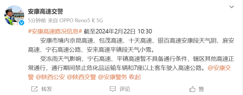 據(jù)安康高速交警消息:截至2024年2月22日10:30,安康市境內(nèi)京昆高速、包茂高速、十天高速、銀百高速安康段天氣陰、麻安高速、寧石高速公路、安來高速平鎮(zhèn)段天氣小雪。受凍雨天氣影響,寧石高速、平鎮(zhèn)高速暫不具備通行條件,轄區(qū)其他高速正常通行,通行期間禁止;愤\(yùn)輸車輛和7座以上客車駛?cè)敫咚俟贰?span style="display:none">ELM安康新聞網(wǎng)