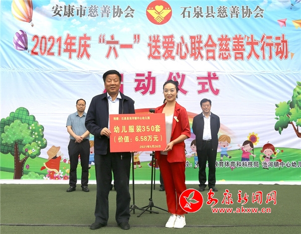 本網訊(通訊員 張蕾)5月26日,安康市慈善協(xié)會2021年慶“六一”向困難兒童送愛心慈善聯合大行動在石泉縣池河鎮(zhèn)中心幼兒園正式啟動。此次活動主題為“童心筑夢•愛暖明天”,旨在用大愛溫暖孩子們的心,讓他們感受到社會各界的關愛,在愛的呵護下健康快樂成長。