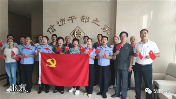 雨后的蔣家坪茶山,空氣清新怡人,市信訪局在家全體黨員干部在這里盡情地揮舞著小紅旗,歌唱《沒有共產(chǎn)黨就沒有新中國》;在北京駐京工作組駐地,在市政府副秘書長、市信訪局長馬霞的帶領(lǐng)下,大家高歌《沒有共產(chǎn)黨就沒有新中國》。雖遠隔千山,但大家用嘹亮動聽的歌聲重溫紅色歷史,匯聚了對黨、對祖國最真摯的情感。