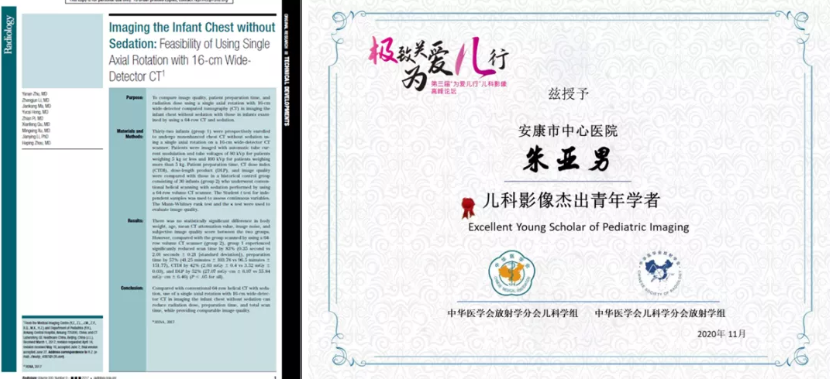 第一次RSNA投稿的成功讓他們備受鼓舞,但他們并沒有沾沾自喜,回國后朱主任立刻抓住時機,加大推進RSNA投稿摘要的英文文章的轉化過程。但轉化的過程并不順利,前后經(jīng)歷了共十幾次修稿,2018年1月,文章終于被世界最頂級的放射學雜志《Radiology》收錄發(fā)表。這是全國第一篇利用Revolution CT發(fā)表在《Radiology》上的文章,朱亞男主任(醫(yī)學影像學博士)也因此在2020年獲得了中華醫(yī)學會放射學分會兒科學組和中華醫(yī)學會兒科學分會放射學組授予的“兒科影像杰出青年學者”的稱號。