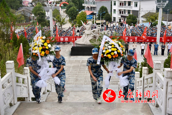 在戰(zhàn)斗紀(jì)念碑前,大家集體默哀,并向烈士敬獻(xiàn)花籃。講解員生動講述著牛蹄嶺的戰(zhàn)斗事跡,在場的每一位仿佛回到了那個戰(zhàn)火紛飛的年代,真切感受到革命先烈不怕犧牲、甘于奉獻(xiàn)的紅色精神。隨后,校黨總支副書記徐信濤作了題為“賡續(xù)紅色基因,肩負(fù)祖國未來”的報告。徐書記從18歲烈士陳祥榕以身護(hù)國講到東京奧運會上14歲少女全紅嬋為國爭光,再到習(xí)近平總書記來陜考察對青年學(xué)生的深切寄語,希望同學(xué)們在高中新起點上,扣好人生的“第一?圩”,立大志,明大德,成大才,擔(dān)大任,以自己的優(yōu)異成績告慰革命先烈,以自己的優(yōu)異表現(xiàn)實現(xiàn)強國夢想。接著,在高一年級郭紅梅老師的帶領(lǐng)下,全體學(xué)生面對紀(jì)念碑莊嚴(yán)宣誓,錚錚誓言,清澈響亮,無不透露出新時代少年報效祖國的堅定信心。