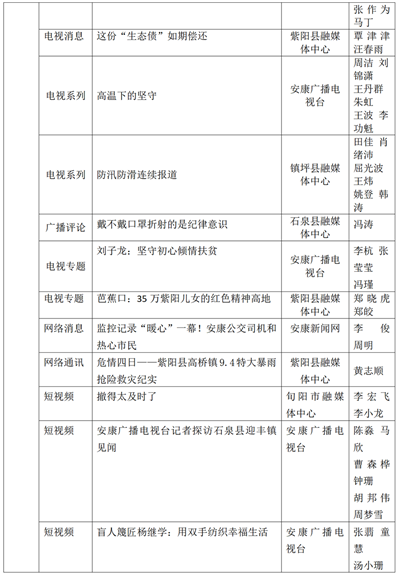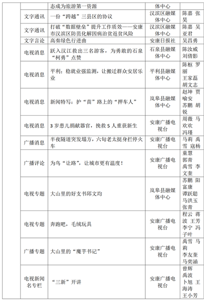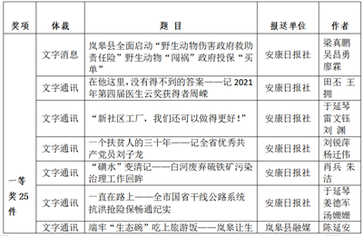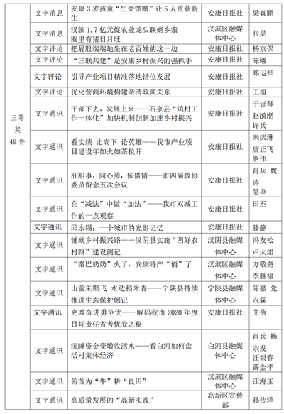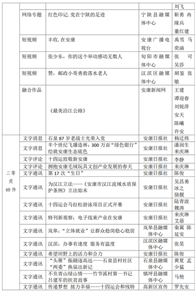 獲得本次安康新聞獎作品共計(jì)114件,其中一等獎25件(報(bào)紙類10件,電視廣播類10件,新媒體類5件)、二等獎40件(報(bào)紙類15件,電視廣播類15件,新媒體類10件)、三等獎49件(報(bào)紙類20件,電視廣播類16件,新媒體類13件)。張俊等16名同志獲得安康市優(yōu)秀新聞工作者稱號。從評選的范圍、內(nèi)容、體裁、形式等方面看,都好于往年。
