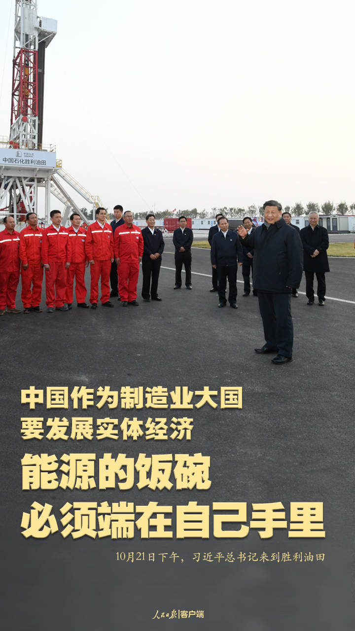 21日下午,習近平總書記來到勝利油田,登上鉆井平臺,察看作業(yè)情況,看望慰問石油工人。今年是勝利油田發(fā)現(xiàn)60周年。習近平代表黨中央向廣大石油職工致以誠摯問候。習近平指出,石油能源建設(shè)對我們國家意義重大,中國作為制造業(yè)大國,要發(fā)展實體經(jīng)濟,能源的飯碗必須端在自己手里。希望你們再創(chuàng)佳績、再立新功。