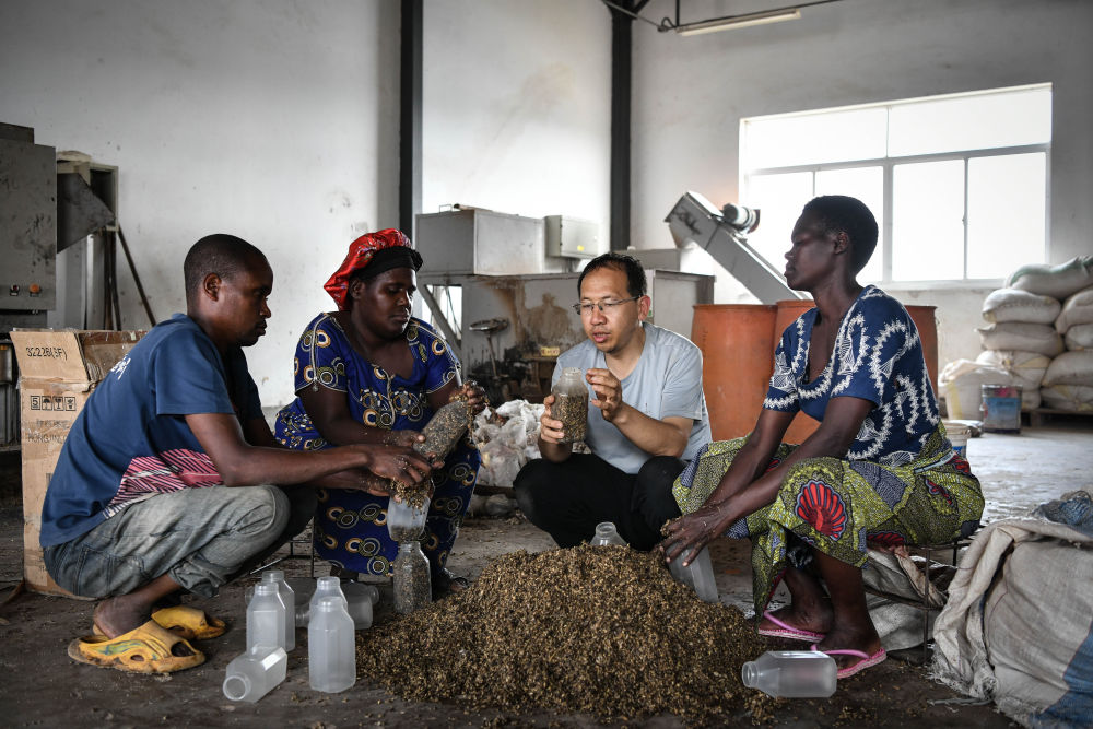 2024年8月13日,在盧旺達南方省胡耶區(qū)的中國援盧農(nóng)業(yè)技術(shù)示范中心,菌草專家陳曉斌(右二)與當(dāng)?shù)剞r(nóng)民一起制作菌種培養(yǎng)料。新華社記者 韓旭 攝