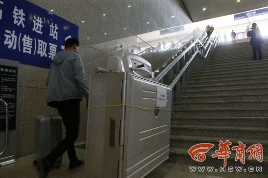 在地面一層,“親情服務(wù)崗”工作人員表示,如果出行的殘疾人是從地鐵口出來,根本不用乘升降機(jī),只需在負(fù)一層的高鐵售票窗口買好高鐵票,然后拿著票到鐵路到達(dá)口4的地方,找工作人員,他們就會(huì)將人直接帶到列車上。記者納悶的是,讓殘疾人的設(shè)施成了擺設(shè),而貼心服務(wù)為何又不公之于眾。 華商報(bào)記者 苗巧穎 攝影 張杰