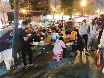 4月1日晚8時(shí)許,記者來(lái)到交大街,蘭蒂斯城小區(qū)門(mén)前熱鬧不已。麻辣燙、砂鍋、炒面、餃子、餛飩、米線、臭豆腐……各種小吃應(yīng)有盡有,近20個(gè)小攤販把小區(qū)門(mén)前的人行道包圍得水泄不通。每個(gè)小吃攤都有不少食客,生意紅火的同時(shí),地面上卻是一片狼藉。