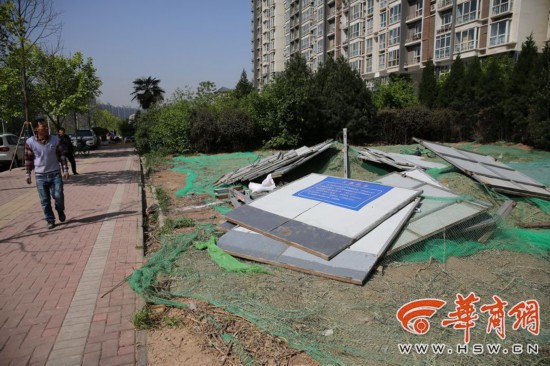 4月9日上午,華商報記者在小區(qū)正門東側(cè)綠化帶看到,有一片地已被平整出來,施劃了白線。根據(jù)圍擋上的“工程概況”,施工單位受雁塔區(qū)城管局委托,準(zhǔn)備在這里建設(shè)“渡塵閣公廁工程”,工期為90天。