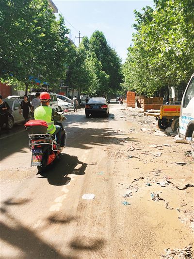 除了擁堵外,臟亂問(wèn)題更是讓大家煩心。記者看到,在體育館東路北段的西側(cè),建筑垃圾、磚塊堆、塑料袋和廢棄材料等隨處可見(jiàn)、任意堆積,人行道已不復(fù)存在。一工地內(nèi)渣土與水混合在一起,使這條路泥濘不堪,空氣中也彌漫著嗆人的塵土味道,有的居民出行戴了口罩!斑@個(gè)工地在這里一個(gè)多月了,垃圾、泥土、揚(yáng)塵到處都是,灑過(guò)水后路上又變得泥濘,統(tǒng)共一百來(lái)米的路,大路走不成,人行道被霸占!奔易”謪^(qū)工商局家屬樓的魏師傅推著嬰兒車,正在小心翼翼地邊走邊看,以躲避過(guò)往車輛。
