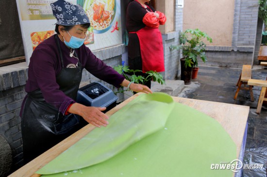 西安白鹿原,56歲的樊向麗在面店門口搟菠菜面,一個(gè)面團(tuán)在她的手下20來分鐘就搟成直徑1.2米的大面皮。(記者 魏永賢)