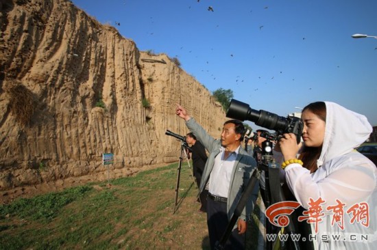 崖沙燕到此安家,當?shù)夭簧倬用褚猜動嵹s來觀賞。當?shù)匾幻用裾f,每天下午,土崖下的路上都停滿了車。