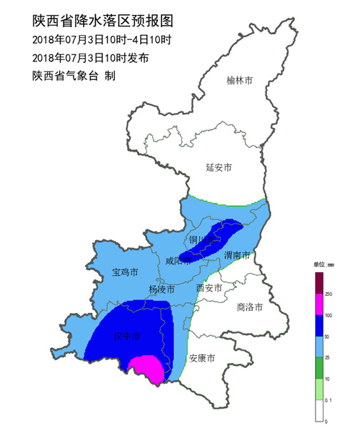 預(yù)計7月3日白天到晚上漢中地區(qū)、安康西部、關(guān)中北部仍將出現(xiàn)50毫米以上的降水,漢中南部局地可達(dá)100毫米以上。