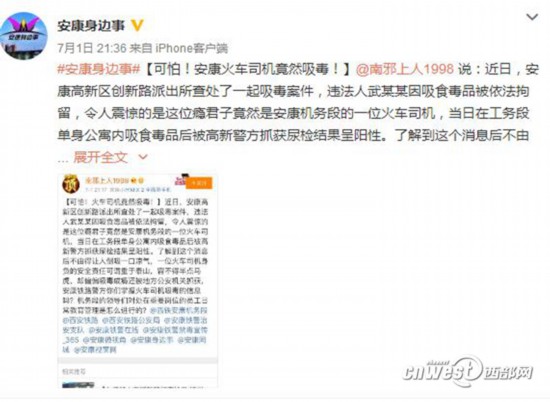 網(wǎng)友微博報(bào)料安康一火車司機(jī)吸毒被拘留。
