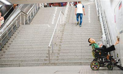 他將電動輪椅開到無障礙設施處,用腳按下求助按鈕。