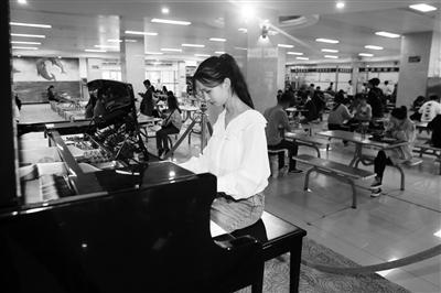 學(xué)生在食堂里彈鋼琴 記者 黨運(yùn)攝 大學(xué)食堂里一架鋼琴的亮相,平添了幾分文藝范。學(xué)生小張說,聽著鋼琴曲吃飯,愣是把一碗油潑面吃出西餐的感覺來。 演奏者都是……