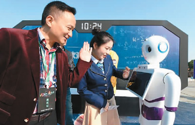 | 圖為科大訊飛(首屆)全球1024開(kāi)發(fā)者節(jié)展示區(qū)內(nèi),參觀者在和智能語(yǔ)音機(jī)器人進(jìn)行互動(dòng)體驗(yàn)。新華社記者 郭 晨攝 |