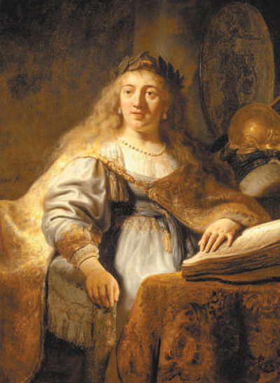 在《穿金邊斗篷的少女》這幅作品中,為了凸顯對明暗光影效果的處理能力,畫中人身著黑色斗篷,連同灰黑的背景,大面積的暗部將作為重點的人物面部烘托出來,宛若聚光式的映照,透過少女面部精致的五官,觀眾仿佛感受到了正款款流出的情思。在倫勃朗筆下,美不再僅僅是對漂亮容顏的寫真,光影之間,鮮活的人物個性塑造才是其孜孜以求的關(guān)鍵,成為最打動人心的地方,畫布里充滿被欣賞的氣氛。而他少有的歷史畫作,也無不彰顯其過人的天資。在《書房中的女神密涅瓦》中,老到而精煉的技法、逼真的物象處理、和諧的光影關(guān)系等,很難讓人相信這幅巨作出自年僅29歲的倫勃朗之手。