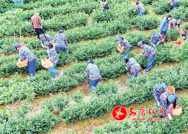 △ 茶農(nóng)在漢濱區(qū)瀛湖鎮(zhèn)火星村茶葉示范園采摘新茶