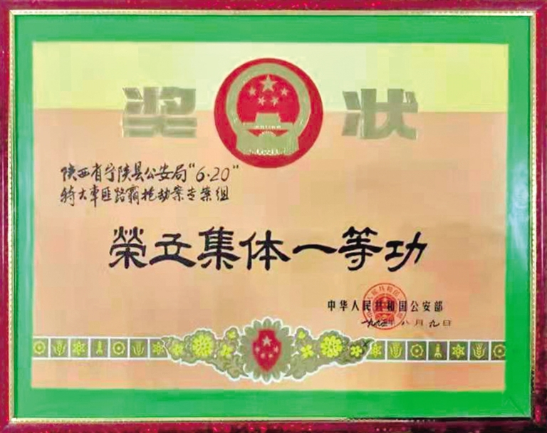 和往常一樣,我正和管理檔案的陳姨一起整理資料,忽然被眼前一塊榮立集體一等功的獎(jiǎng)狀吸引,仔細(xì)查看,發(fā)現(xiàn)上面的詳細(xì)內(nèi)容是:陜西省寧陜縣公安局“6.20”特大車(chē)匪路霸搶劫案專(zhuān)案組榮立集體一等功,落款是中華人民共和國(guó)公安部,時(shí)間是1995年8月9日。