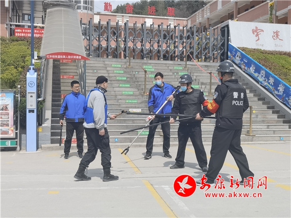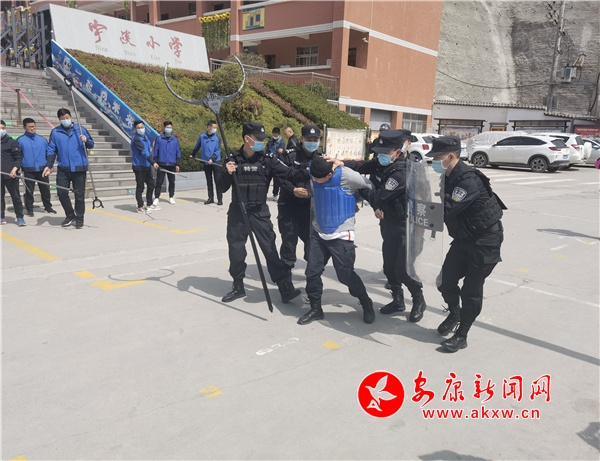演練開始,下午1點(diǎn)30分,入校音樂(lè)響起,兩名校警、家長(zhǎng)護(hù)衛(wèi)隊(duì)、值班老師站在校門口執(zhí)勤,大部分學(xué)生已進(jìn)入校園,還有十幾名學(xué)生正在排隊(duì)等待入校。此時(shí),在學(xué)校旁邊閱讀吧門口徘徊的一名身份不明的“歹徒”突然舉著砍刀沖向校門口,企圖闖入校園,值班校警見(jiàn)狀立即啟動(dòng)一鍵式報(bào)警向公安部門求助,值班老師快速做出反應(yīng),拉響學(xué)校警報(bào),關(guān)閉伸縮門,組織未入校的學(xué)生趕往緊急避難場(chǎng)地躲避。同時(shí),校警和值班老師手持器械,在校門口對(duì)“歹徒”進(jìn)行阻擊,拖延時(shí)間。