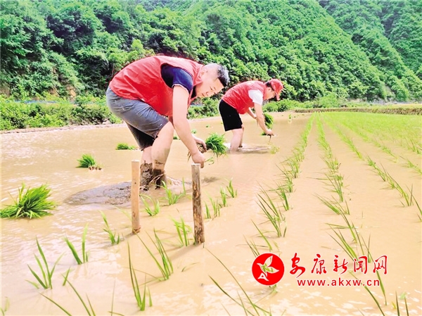 本網(wǎng)訊(通訊員 陳陽軍)農(nóng)忙時(shí)節(jié)不等人。不久前,地處秦嶺腹地的寧陜縣龍王鎮(zhèn)棋盤村,有一群人,他們身穿“紅馬甲”搶抓好時(shí)節(jié)移栽秧苗,在水田里來回穿梭,幫助村民把一株株秧苗整齊有序地插入水田里,在藍(lán)天白云的映襯下,田間地頭呈現(xiàn)出一幅忙碌的夏耕畫卷。