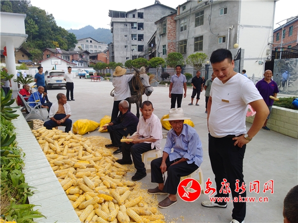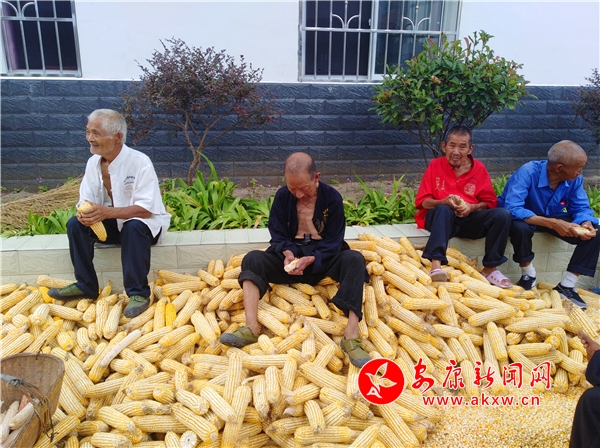 一大早,敬老院的費(fèi)院長就安排院內(nèi)2位職工到玉米地組織工人采收玉米。為了安全起見,院內(nèi)有勞動能力的老人沒有安排外出采收,而是負(fù)責(zé)在敬老院內(nèi)組織人員剝玉米、晾曬。工人吆喝著騾子隊(duì)拖著一筐筐玉米回到敬老院,李建國等幾個(gè)有勞動能力的五保老人就過來搭手,將一筐筐玉米攤放在院場內(nèi)晾曬。工作人員和其他的五保老人一起,紛紛參與到剝玉米的行列,院場中堆滿了金燦燦的玉米,老人們個(gè)個(gè)拿著玉米棒子正在脫粒。今年的玉米大豐收,個(gè)個(gè)玉米棒子顆粒飽滿,顏色金黃誘人。大家忙活著,露出豐收的喜悅。