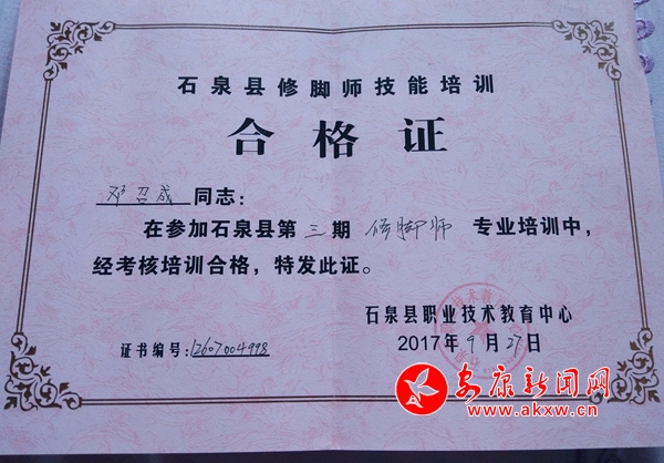 “多謝當初你們讓我去參加修腳培訓,學得一技之長,在外面找到了工作,也感謝黨的好政策,當初參加培訓每天包吃包住還補助交通費。我一定好好干,給村里的貧困戶帶個好頭。”這次回村,鄧召成還專門來到村委會向包戶干部表示感謝。