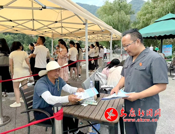 在各大景區(qū),法官干警給旅游景區(qū)的工作人員講解相關(guān)法律知識、教他們?nèi)绾我婪皶r處理與游客之間的矛盾糾紛,確保一旦發(fā)生旅游糾紛,第一時間有人報告、第一時間有人接待、第一時間有人解決。向來往游客和景區(qū)工作人員發(fā)放旅游法宣傳手冊,對游客較為關(guān)注的“旅游者的權(quán)利、旅行社的義務(wù)、旅游安全如何保障、旅游糾紛如何解決”等進行詳細(xì)解答,并向游客積極熱情解答各類法律咨詢。