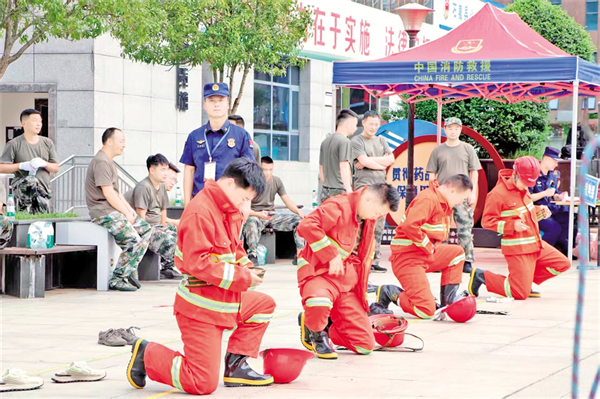 “開始!”裁判一聲令下,參賽隊(duì)員們?nèi)珉x弦之箭,迅速在原地依次穿戴全套防護(hù)裝備。