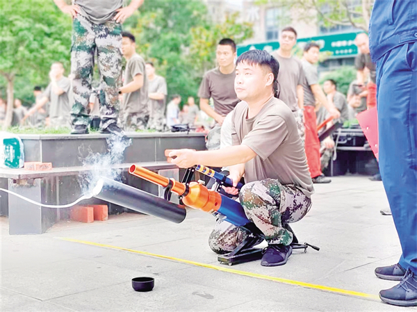“應(yīng)急通信與拋投設(shè)備”科目賽場(chǎng),科技含量高。無人機(jī)騰空而起,飛向模擬的7樓窗口查看電話號(hào)碼,衛(wèi)星電話迅速撥通,接收考官指令;拋投器精準(zhǔn)發(fā)射,命中目標(biāo)區(qū)域。
