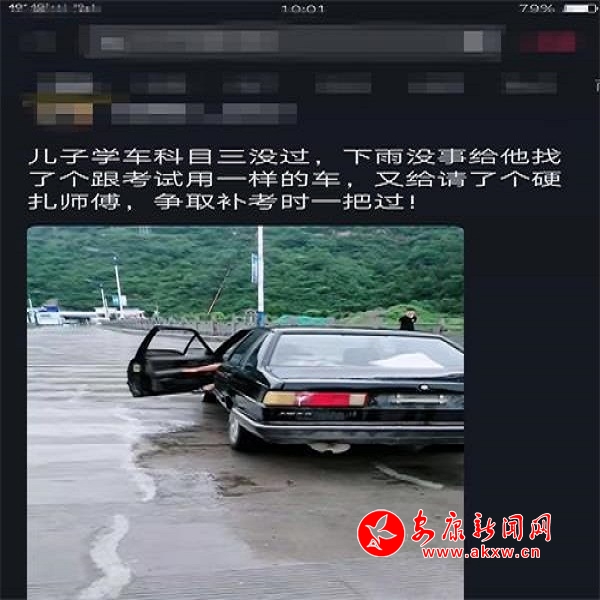 2019年7月17日,梁某某吃完中午飯后,想到其兒子去年考駕駛證科目三沒有過,今年暑假需要補考,又擔心過不了,就動了小心思,何不提前找一個和考試車差不多的給他練練手,這樣考試成功的幾率會大些,便找來一輛黑色桑塔納交由兒子練習,并發(fā)了一段抖音視頻:“兒子科目三沒過,下雨沒事給他找了個跟考試用一樣的車,又給請了個硬扎師傅,爭取考試時一把過”,旬陽縣公安局交警大隊甘溪中隊民警根據(jù)視頻找到其練車地點,對梁某某父子的違法行為進行了現(xiàn)場批評教育,并將其傳喚到中隊接受調查,目前案件正在辦理中。