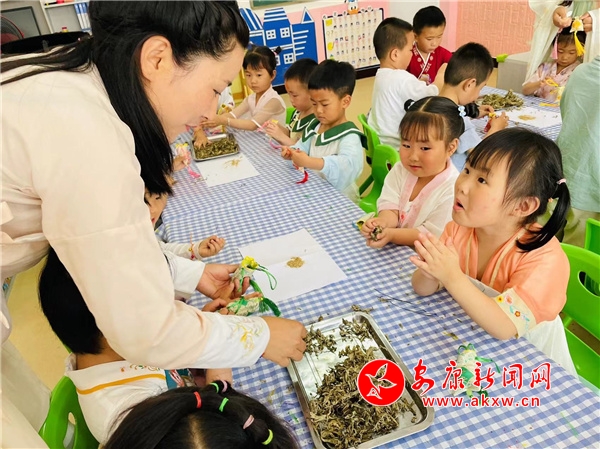 活動前,老師們精心準備了主題教育,通過視頻、兒歌教學、師幼互動等形式一起追溯端午節(jié)的由來,講述屈原的愛國故事,了解端午節(jié)吃粽子、賽龍舟、掛艾草、做香包等習俗;顒诱介_始,只見老師和孩子們身著漢服,仿佛回歸漢唐。孩子踩著一條由艾草鋪成的道路,老師依次為小朋友系“五彩繩”、雄黃“畫額”、“沐蘭湯”凈手,寓意驅(qū)邪避蟲,祝福孩子平安健康。儀式結(jié)束后,孩子們在院內(nèi)品嘗了各式香粽、大蒜、雞蛋和水果。隨后又在班級制作了端午吉祥物——香包,并相互佩戴。最后,大家齊聚院內(nèi),開展了“賽龍舟”、投壺、射五毒等端午傳統(tǒng)游戲活動。