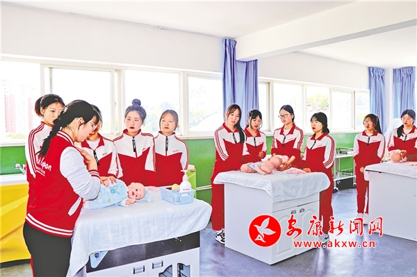 幼兒保育專業(yè)學(xué)生在課堂上展示幼兒護(hù)理技能。