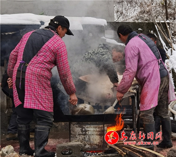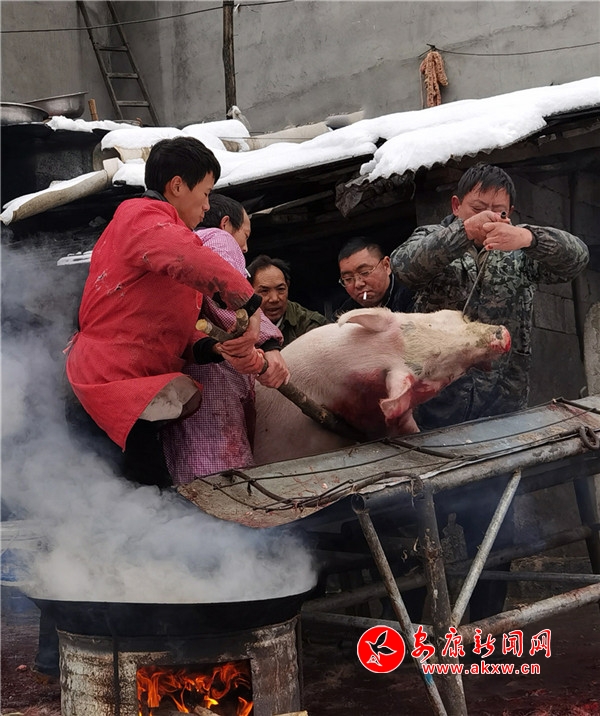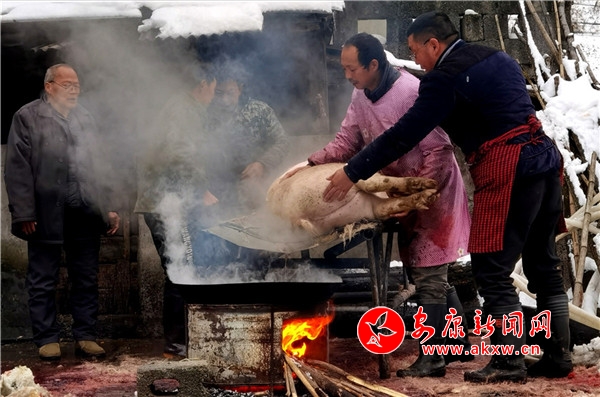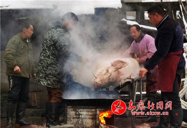 時逢陰歷十月初九,鎮(zhèn)坪縣迎來了入冬以來第一場降雪。漫天大雪,給原本氣溫偏低的化龍山腳下的張家坪增添了寒冷。然而,上竹鎮(zhèn)化龍村8組村民張成凱和叔叔張秀柱,卻帶著家人熱火朝天地忙著殺豬腌制臘肉,絲毫沒有寒冷的感覺。