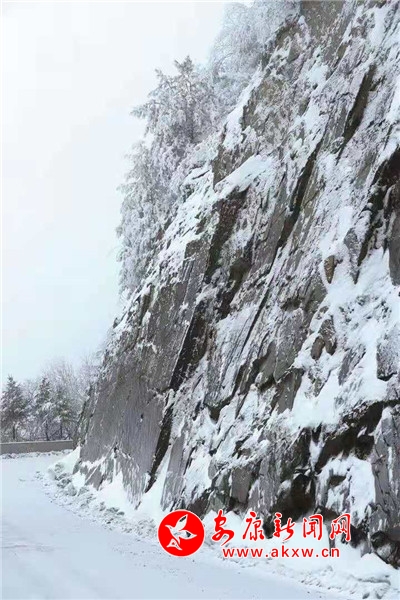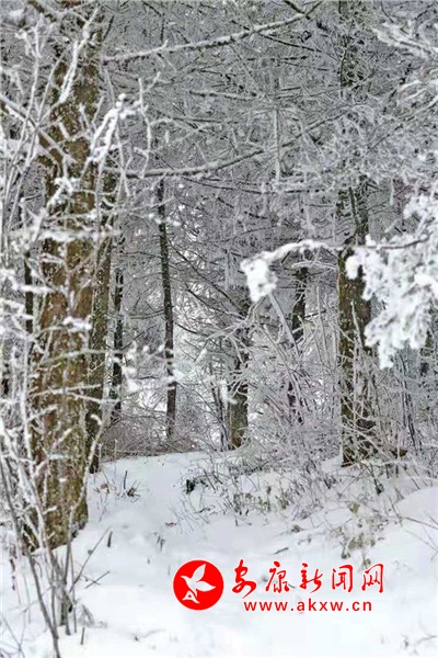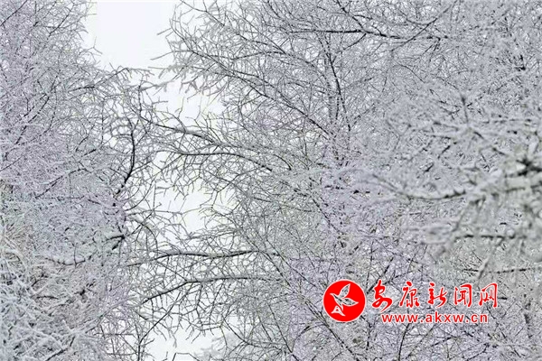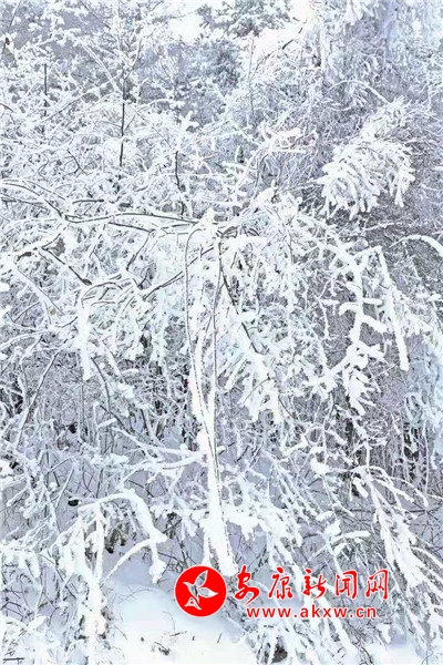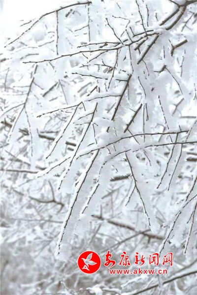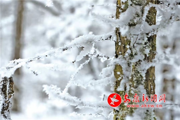在青松的針葉尖上,在柔韌的枝條末梢,冰凌、霧凇、雪柳、樹掛……鋪天蓋地,肆意飛揚(yáng)。憑欄遠(yuǎn)眺,萬千輕羽蔓延鋪陳,寒山枯色被這天地間的精靈喚醒?丈讲灰娙耍勓┞渎。
